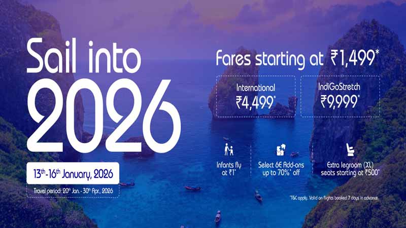 New Delhi: IndiGo, India’s preferred airline, today announced the launch of its New Year sale ‘Sail into 2026’, offering customers attractive all-inclusive one-way fares across select domestic and international sectors, along with exclusive discounts on popular ancillary services. The sale will be open for bookings from 13 January 2026 to 16 January 2026, for travel between 20 January 2026 and 30 April 2026. The offer is valid on bookings made at least seven days prior to departure and is available across all booking channels.